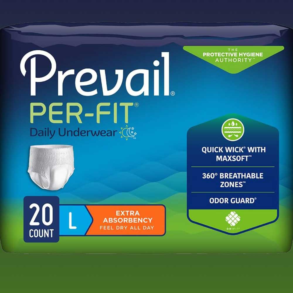 Prevail Incontinence Per-Fit Protective Underwear in size large provides superior protection and comfort for individuals with moderate to heavy incontinence. Featuring a high-absorbency core, these underwear quickly lock in moisture, helping to prevent leaks and keep you dry throughout the day. The soft, breathable fabric reduces skin irritation, and the flexible waistband and leg cuffs ensure a secure, snug fit. Equipped with odor control technology, these protective underwear maintain freshness and confidence. With 20 pieces per pack, they offer long-lasting, reliable protection for daily wear and peace of mind.